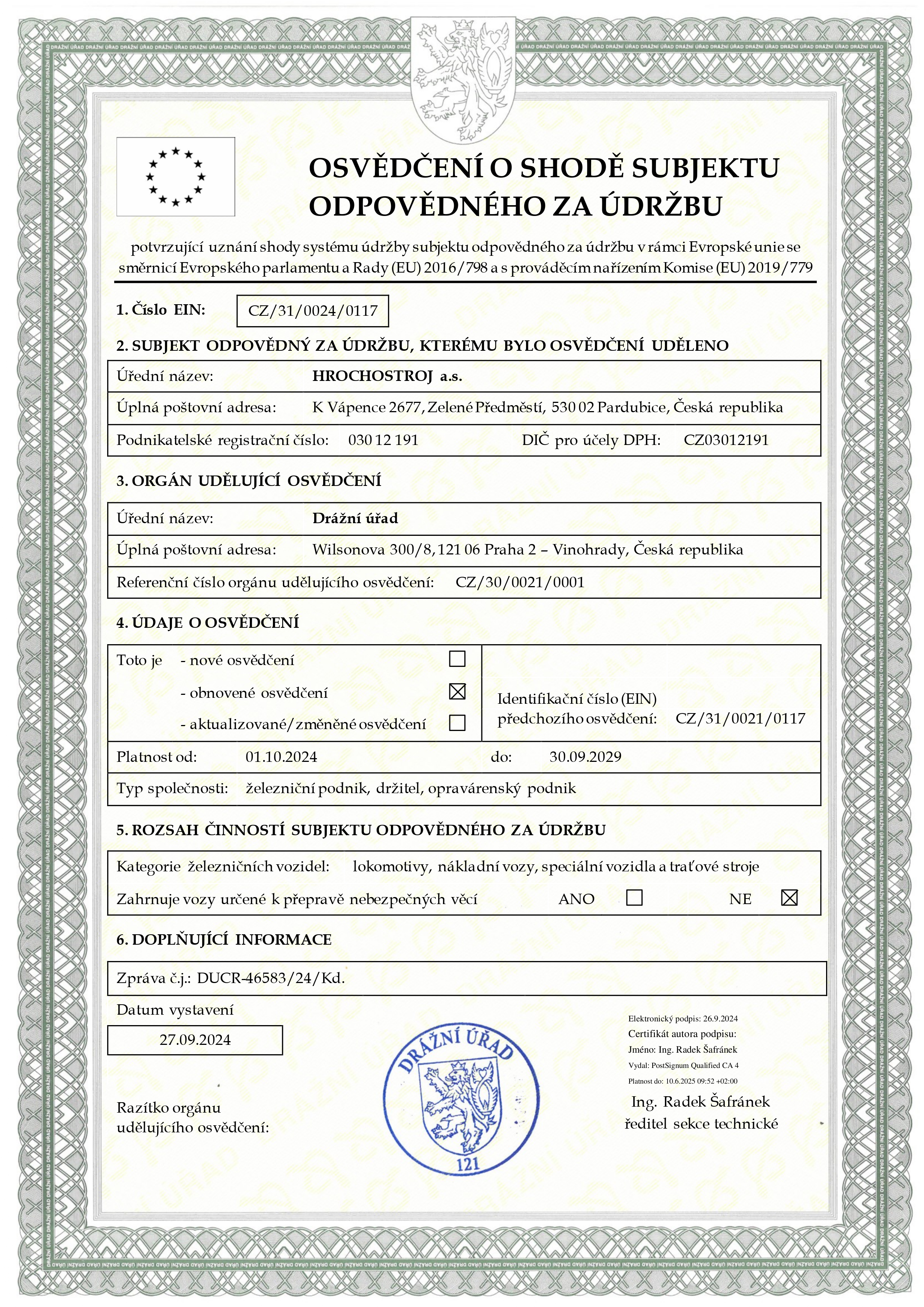 Osvědčení o technické a odborné způsobilosti k vykonávání broušení pojížděných součástí výhybek na ŽSR