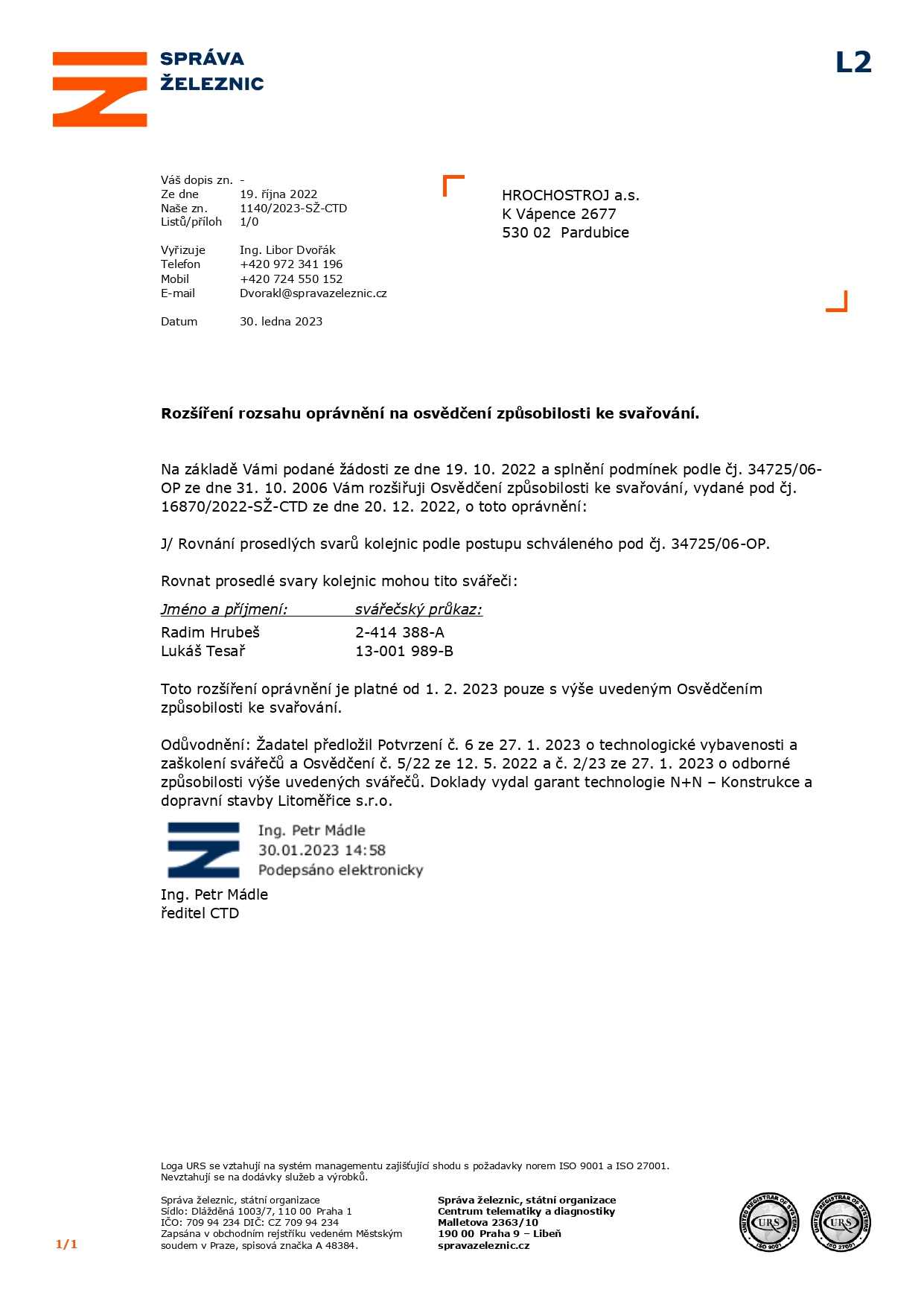 Osvědčení ke svařování kolejnic - Dopravní úřad - SK